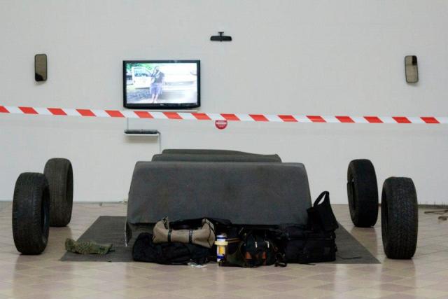 This became the inspiration for our installation at the Biennale Benin 2012, where we came up with the idea of recreating a suggestive replica of the interior of the van as we have experienced it during the trip, using the relics of the actual van since we drove in the van from Lagos to Cotonou for the festival. The installation also featured reconstructed objects that we were obliged to use (or things that used us), such as the road signs, the checkpoint barricades etc. There was equally a large plasma screen on which images and texts from the artists were displayed in a loop – flashes of images after images, with texts. The display was comprised of the actual photographic works by photographers, photo essays that were a joint venture between the photographers and the writer Emmanuel Iduma, as well as photos of participants while on the trip. We created a “pool” of images, which tend to convey a feeling of being submerged in the experience of the trip through images rather than emphasizing on the individual approach of the artists.