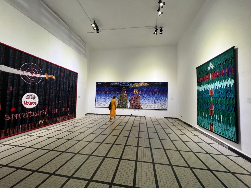 Showing at Houdrouge’s Selebe Yoon is an expansive solo exhibition of the veteran Senegalese artist and cultural activist El Hadji Sy, whose works consist of paintings of variable scales. Some of them are mounted on canvas and hung on walls. Many, on dedicated support allowing the works to interact with a good part of the 1000 metre square space. The depth of El Hadji Sy’s artistic practice – spanning over 50 years – is beyond the scope of this article. That said, one could easily see why his practice would be the jewel in the crown, not only to the Biennale’s theme but for such a space as Selebe Yoon. His work is a culmination of the tugging spirit of defiance that has long constituted the rumbling underbelly of post-independence Africa.