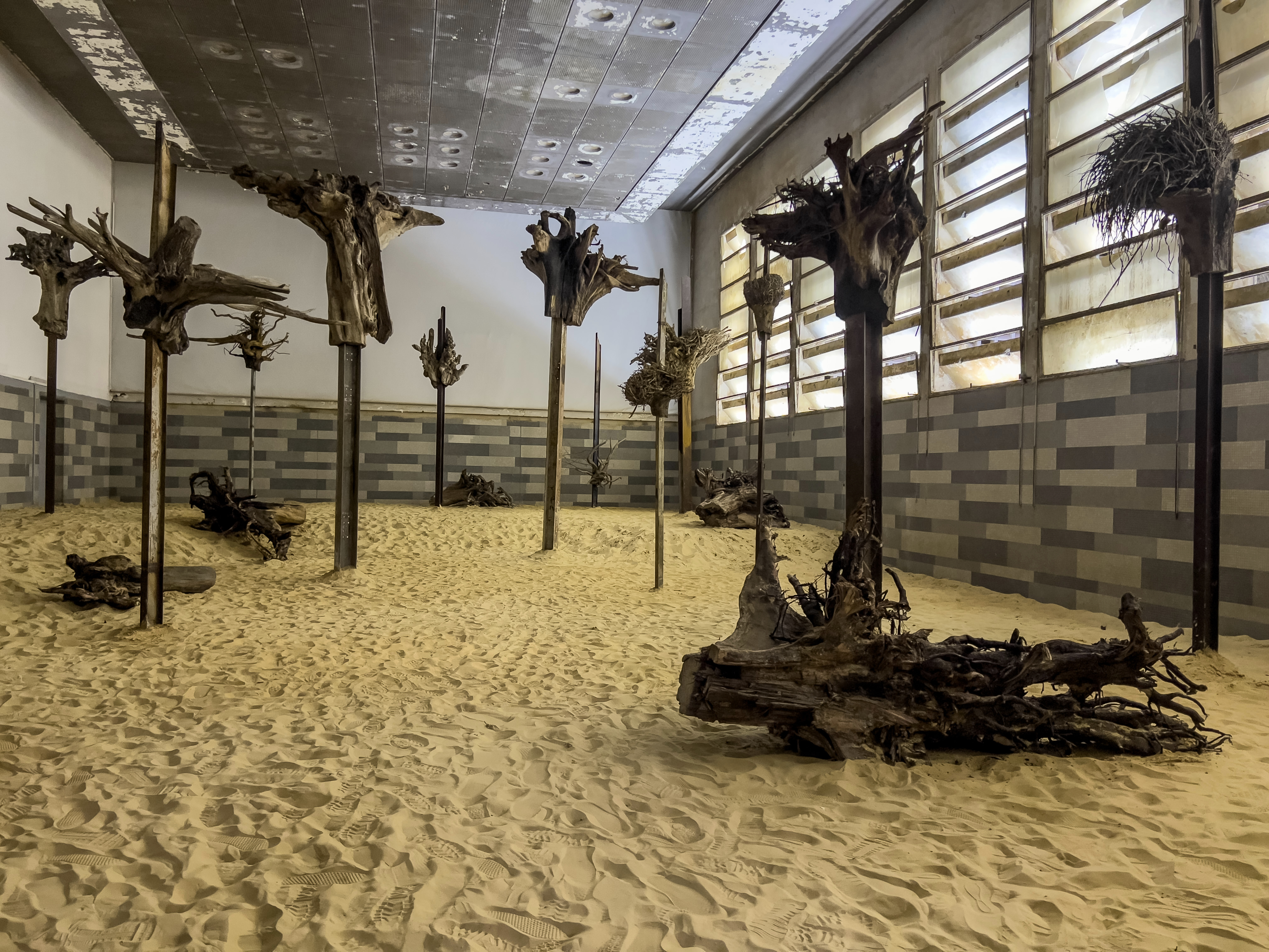 With that in mind, Emmanuel Tussore’s sculptural installation De Cruce (2022) stands out within the central show. An entire chamber of the building is repurposed into a dystopian landscape consisting of dead tree trunks with contorted roots and branches, mounted on heavy, rusty metal H-beams. The dilapidated ceiling and window panes of the space add to its eeriness.